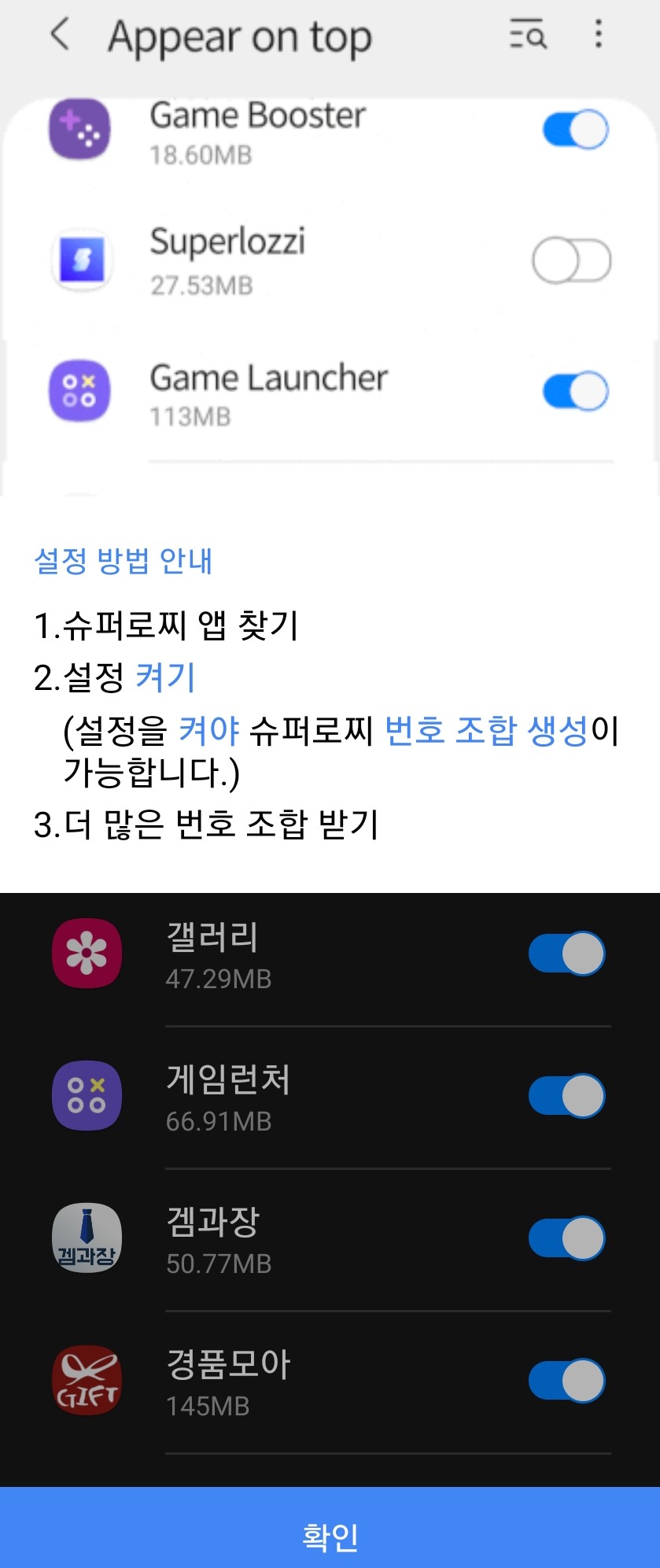 2) 다른 앱 위 표시는 슈퍼로찌-글로벌 앱을 직접 들어가지 않고 바로 팝업창으로 번호조합을 생성해주기 때문이에요.