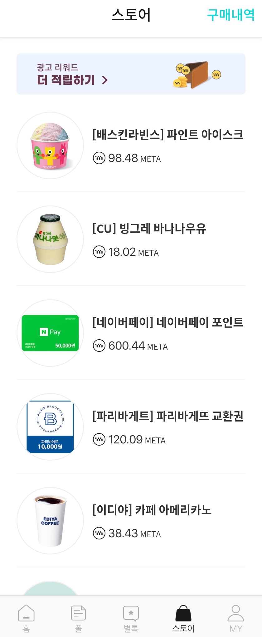 META를 모으셨다면 스토어를 통해 기프티콘으로 바꾸어 사용하실 수도 있고요.