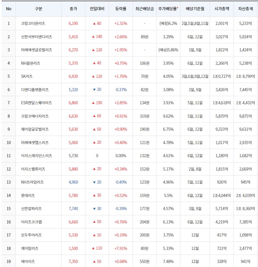 현재 19개 종목이 상장되어 있고 22년 5월 31일에 상장되는 마스턴프리미어리츠까지 추가하면 20종목이 되요.